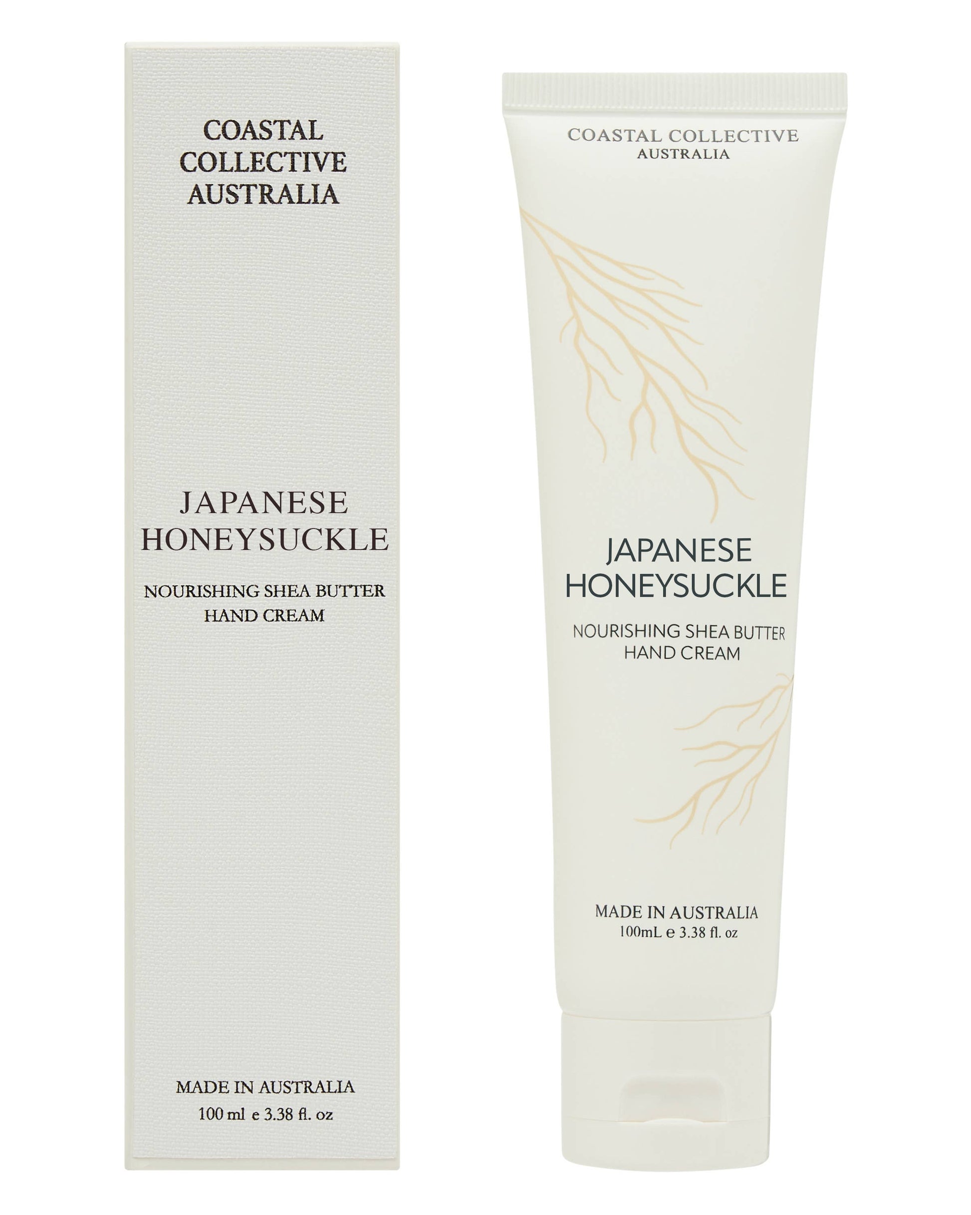 Indulge in the luxurious feel of Coastal Collective Australia's Japanese Honeysuckle Shea Butter Hand Cream. This 100ml cream is a delightful blend of nourishing Shea butter, designed to moisturize and rejuvenate your hands. The captivating scent of Japanese Honeysuckle wraps your skin in a soothing aroma, creating a calming atmosphere around you. Ideal for daily use, this hand cream is a perfect addition to your skincare routine, providing hydration and care for your hands. This hand cream is a testament to the commitment to quality, authenticity, and locally sourced materials.